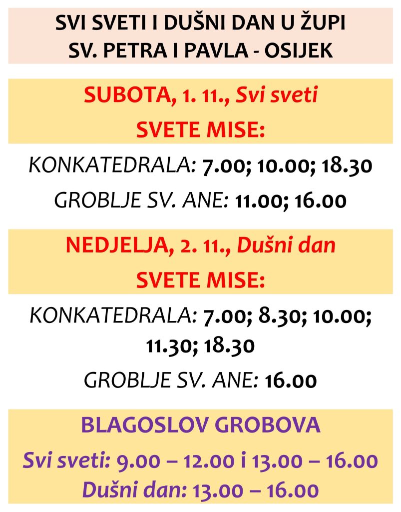 | Nedjelja, 2.11. DUŠNI DAN | 7.00 8.30 10.00 11.30 18.30 16.00 | Konkatedrala: + iz ob. Sombot, Oršaj i + Irena i Viktor + Ivana Galić i + Slavko Mikulić ZA ŽUPLJANE + Iva i Jozo Barišić i + Dragutin Markovčić + iz ob. Iličić i Marković Groblje sv. Ane: + Vinko Bijuković |